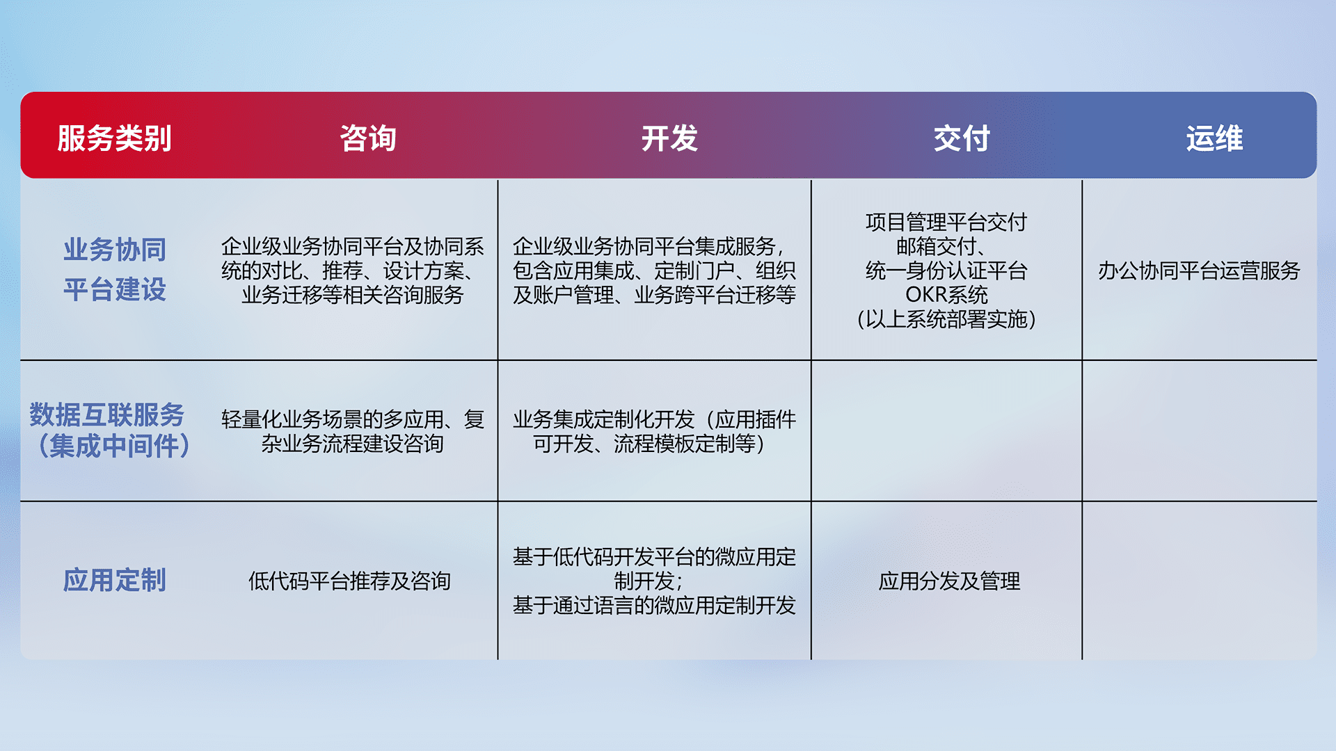针对钉钉、、、、企微、、、IDaas等平台级产品提供产品的规划、、、方案、、、、交付、、定制化开发等服务,,,实现如统一协同办公、、智能客户服务、、、、混合会议管理、、、、智能数据查询、、、等业务场景,,实现数字化转型。。。